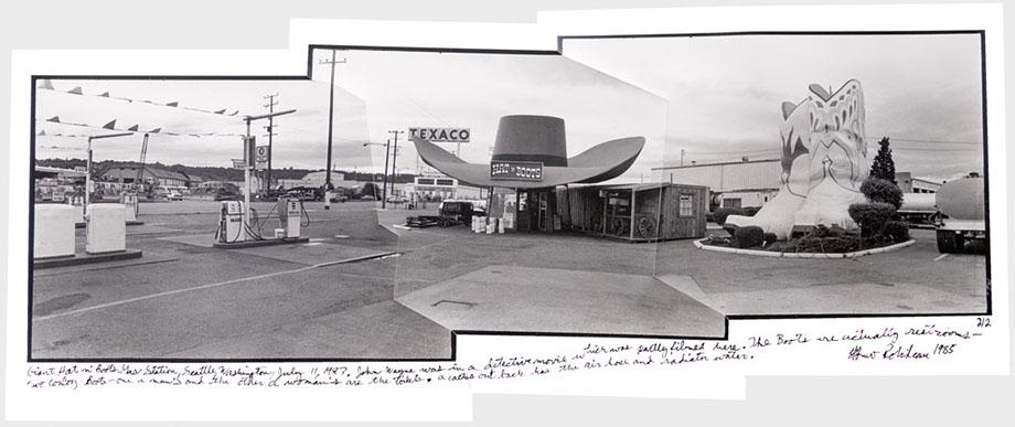 Giant Hat n’ Boots Gas Station, Seattle, Washington, July 11, 1983. John Wayne was in a detective movie which was partly filmed here. The Boots are actually restrooms – two cowboy Boots – one a man’s and the other a woman’s are the toilets. A cactus out back has the air hose and radiator water.