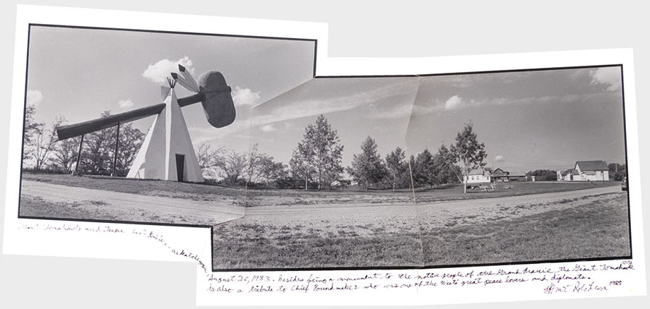 Giant Tomahawk and Teepee, Cut Knife, Saskatchewan, August 26, 1983. Besides being a monument to the Native People of the Grand Prairie, the Giant Tomahawk is also a tribute to Chief Poundmaker who was one of the West’s great peace lovers and diplomats.