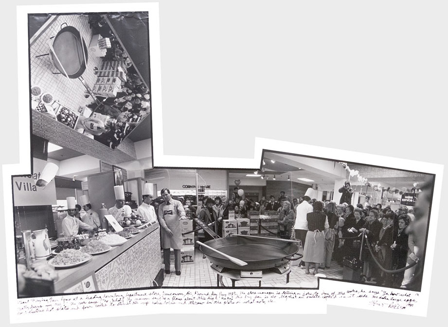 Giant frying pan demo at a leading downtown department store, Vancouver, British Columbia, Ground Hog Day 1985. The store manager is telling a joke to one of the cooks, he says, "Ya know what really burns my ass?" The cook says, "No, what?" The manager says, "Oh a flame about this high! Ha, ha!" This fry pan is so big that an omelet cooked in it needs 300 extra large eggs, eight electric hot plates, four cooks to stir it all up holus-bolus and throw in the plates of what-nots, and a bull-cook boss chef who keeps it all moving along according to the recipe.