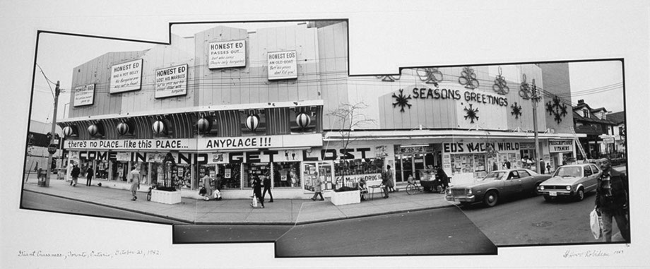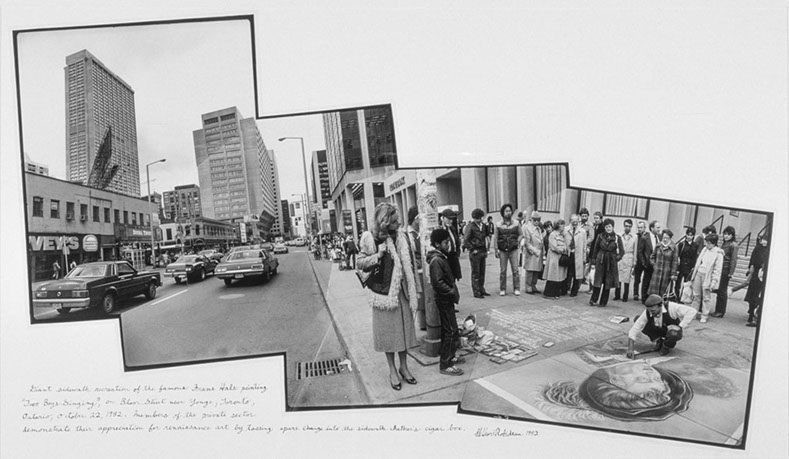 Giant Sidewalk Recreation of the famous Frans Hals painting, "Two Boys Singing", on Bloor Street near Yonge, Toronto, Ontario, October 22, 1982. Members of the private sector demonstrate their appreciation for renaissance art by tossing spare change into the sidewalk chalker's cigar box.