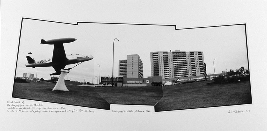 Giant Waste of the taxpayer's money, obsolete military hardware, coming in low over the Courts of St. James Shopping Mall and apartment complex, Portage Avenue, Winnipeg, Manitoba, October 6, 1982