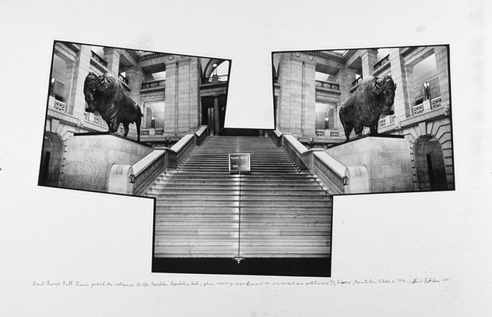 Giant Bronze Bull Bisons guard the entrance to the Manitoba Legislature Hall, plus warning sign (Serait-ce un consiel aux politiciens?), Winnipeg, Manitoba, October 6, 1982.