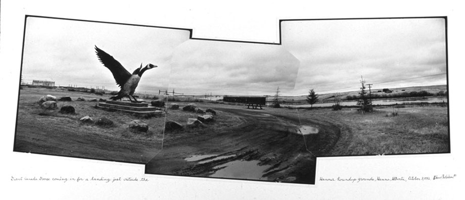Giant Canada Goose coming in for a landing just outside the Hanna Roundup Grounds, Hanna, Alberta, October 3, 1982.