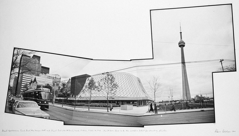 Giant Upside-down Punch Bowl (Roy Thomson Hall) and Giant Dart (the CN Tower), Toronto, Ontario, October 21, 1982. The CN Tower claims to be the world's tallest freestanding structure.