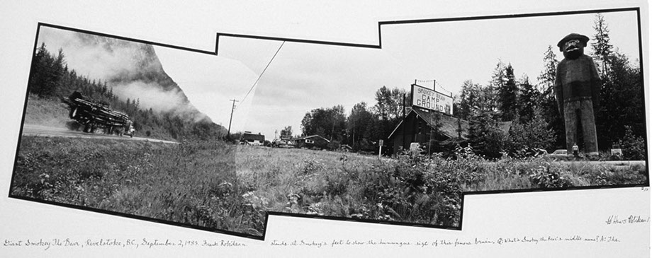 Giant Smokey The Bear, Revelstoke, British Columbia, September 2, 1983. Frank Robideau stands at Smokey's feet to show the size of this humungous bruin. Question- What's Smokey the bear's middle name? Answer- The.